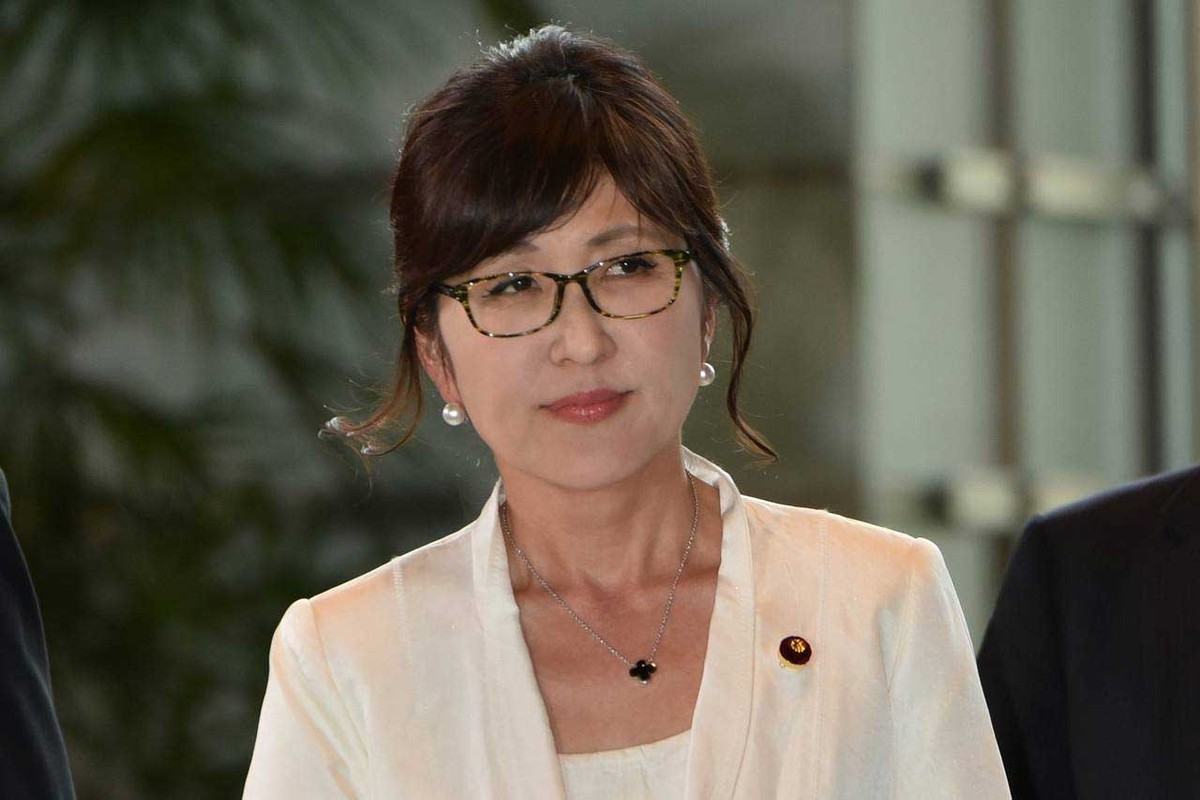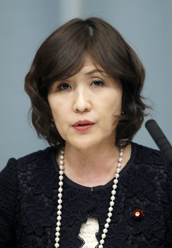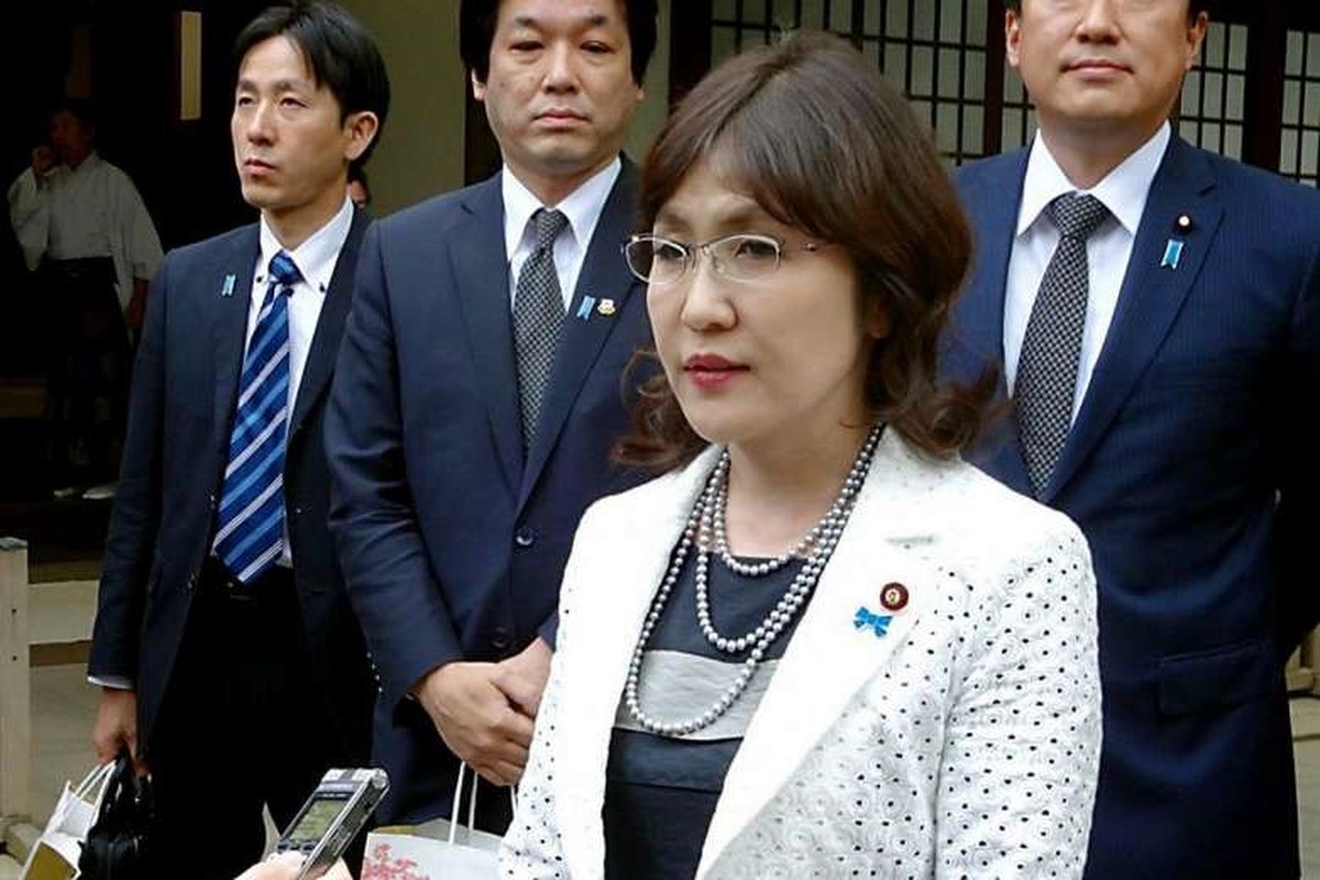Chuỗi vòng ngọc trai dáng dài kết hợp với trang phục màu đen giúp tân Bộ trưởng Quốc phòng Nhật Bản trở nên sang trọng và quyền lực hơn.