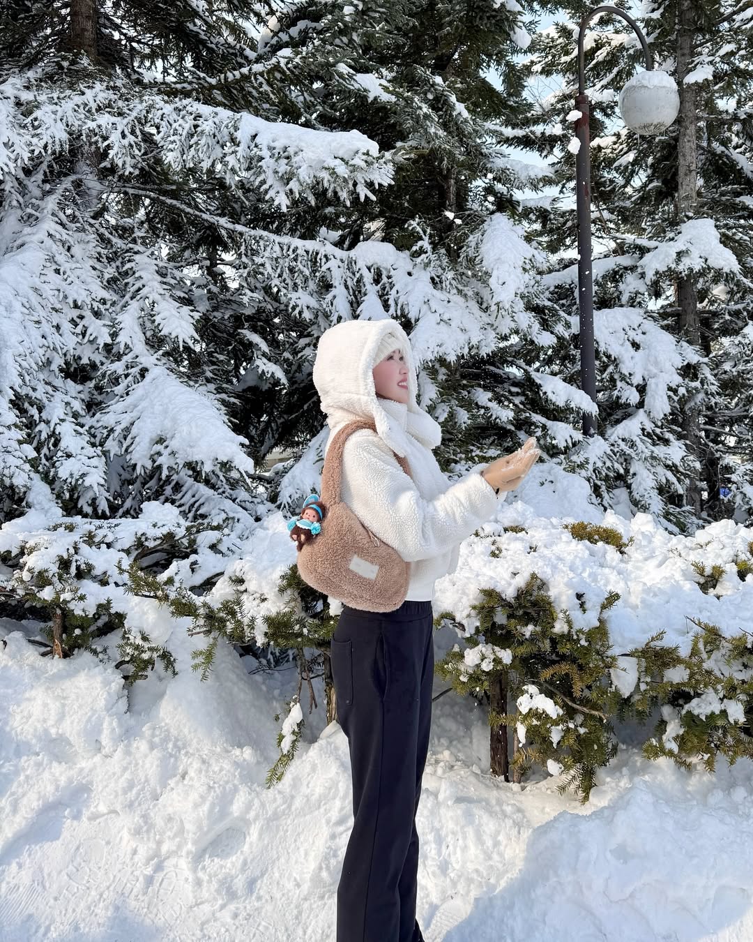 Trong chuyến đi vừa rồi ở Nhật Bản, Chloe Nguyễn đã có những khoảnh khắc ngọt ngào và lãng mạn cùng bạn trai. Thời trang dưới tuyết của cô cũng được người theo dõi chú ý. Trong chuyến đi, Chloe chọn trang phục đơn giản nhưng vẫn giúp giữ ấm cơ thể. Cô nàng diện áo khoác lông trắng đến từ thương hiệu thời trang thể thao Alo, phối cùng quần đen đơn giản. Phụ kiện gồm mũ len Jacquemus, túi lông và găng tay màu be.