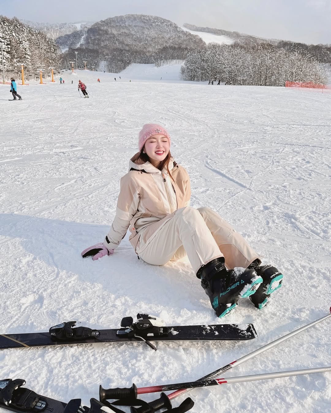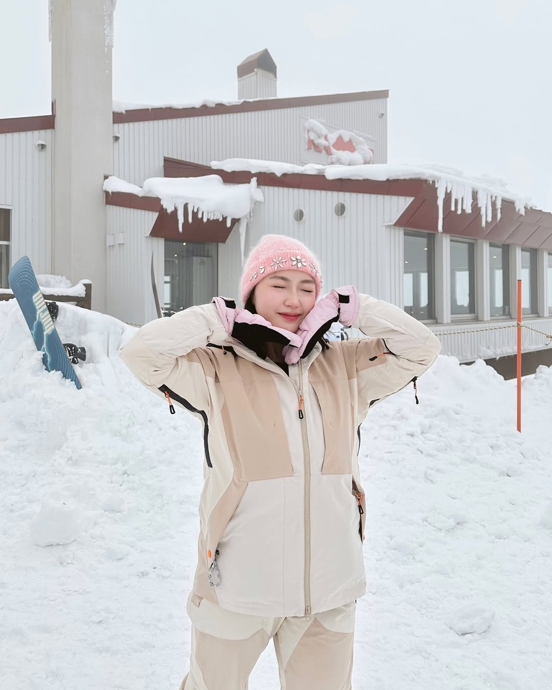 Trang phục trượt tuyết màu be và trắng được Chloe Nguyễn phối cùng mũ len hồng đính đá điệu đà. Sự kết hợp giữa gam màu trung tính và những điểm nhấn nữ tính giúp cô nàng vừa giữ ấm vừa trông thời thượng giữa khung cảnh tuyết trắng. Đặc biệt, chiếc mũ len hồng đính đá tạo thêm nét đáng yêu và nổi bật cho tổng thể trang phục.