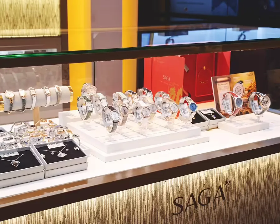 Hải Triều không chỉ bán đồng hồ mà còn cung cấp các dòng trang sức đi kèm, tạo nên một combo hoàn hảo cho người dùng. Nổi bật nhất là sự xuất hiện của thương hiệu Saga – sử dụng pha lê Swarovski chính hãng từ Áo.