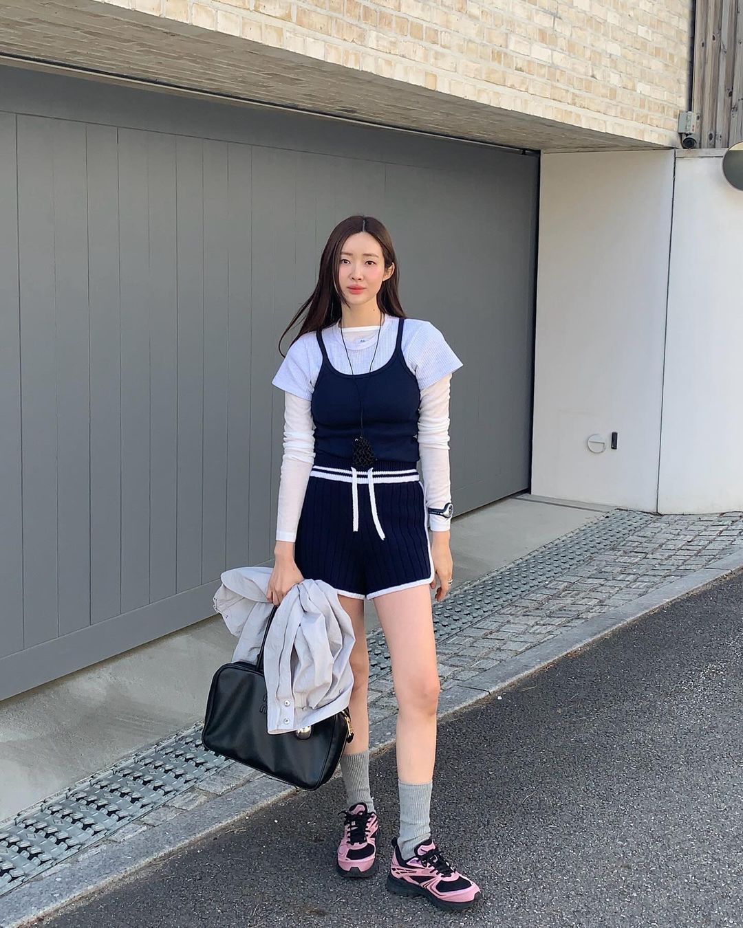 Một bản phối thú vị cho những ngày Hè nóng bức là áo thun dáng ôm mặc cùng áo hai dây và quần shorts. Với trang phục này, bạn có thể mặc thêm một chiếc áo tay dài bên trong để chống nắng. Chỉ cần một đôi giày thể thao, túi xách phù hợp là chúng ta có thể ra ngoài tản bộ, tập thể dục cùng bạn bè.